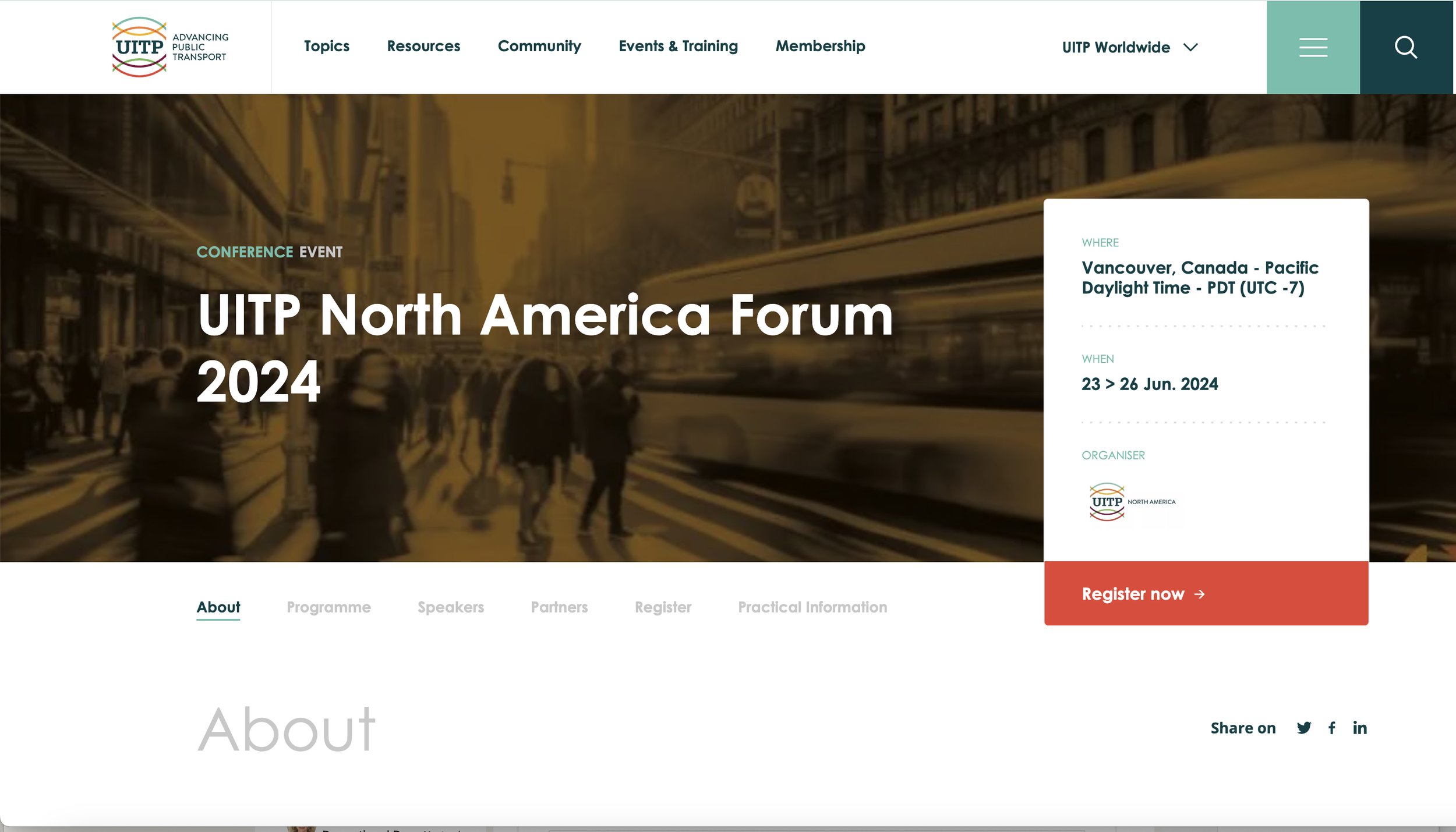 The UITP North America Forum is an annual conference aimed to offer the North America region UITP’s worldwide resources for global connectivity and knowledge, bringing together the most current information and developments for our urban transit industry.